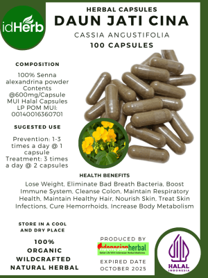 100 Capsule Of Cassia angustifolia, Senna leaf, Daun Jati Cina @600mg for Health All Fresh Natural Herbs spices Indonesian herb Organic Wild Crafted Free Shipping