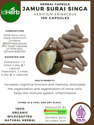 100 Capsule Of Hericium erinaceus, Jamur surai singa lion’s mane, yamabushitake @600mg for Health All Fresh Natural Herbs spices Indonesian herb Organic Wild Crafted Free Shipping