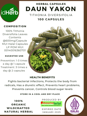 100 Capsule Of Tithonia Diversifolia, Daun Yakon, Shrub Sunflower, Mexican Sunflower, Bolivian Sunflower, Tree Marigold @600mg for Health All Fresh Natural Herbs spices Indonesian herb Organic Wild Crafted Free Shipping