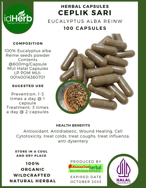 100 Capsule Of Eucalyptus alba Reinw, white gum, khaki gum or poplar gum, ceplik Sari @600mg for Health All Fresh Natural Herbs spices Indonesian herb Organic Wild Crafted Free Shipping