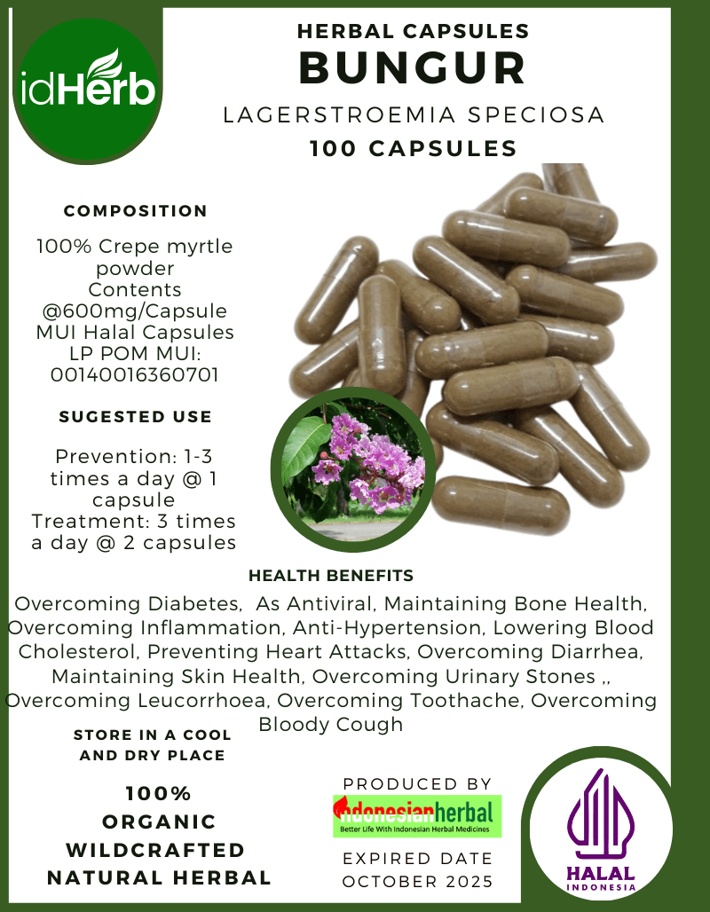 100 Capsule Of Lagerstroemia speciosa / Bungur / Queen’s Crape Myrtle/Crepe Myrtle @600mg for Health All Fresh Natural Herbs spices Indonesian herb Organic Wild Crafted Free Shipping