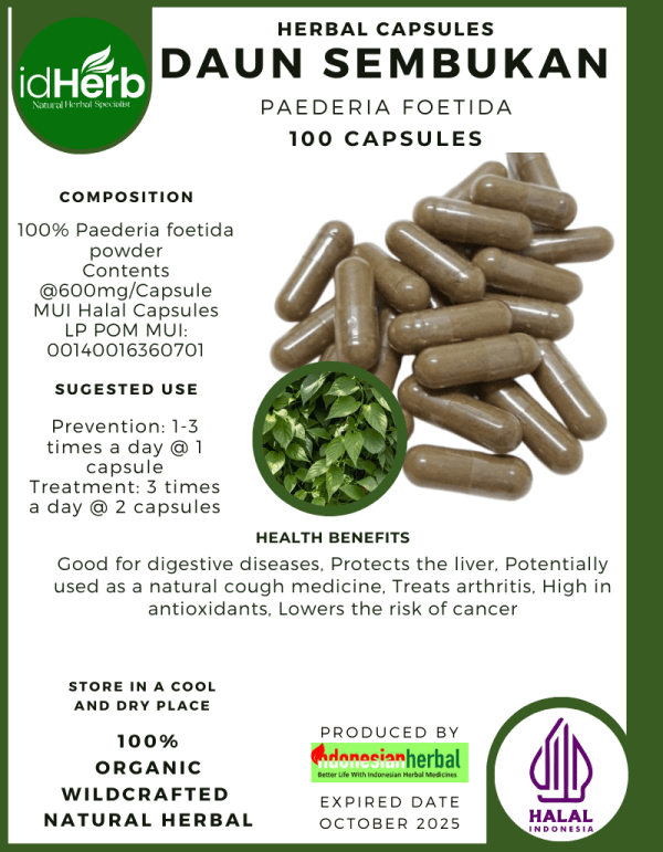100 Capsule Of Paederia foetida, Daun Sembukan, Skunkvine, Chinese fever vine@600mg for Health All Fresh Natural Herbs spices Indonesian herb Organic Wild Crafted Free Shipping