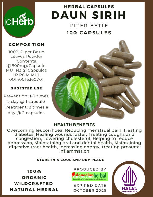 100 Capsule Of Piper betle, Daun Sirih, Betel @600mg for Health All Fresh Natural Herbs spices Indonesian herb Organic Wild Crafted Free Shipping